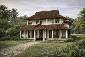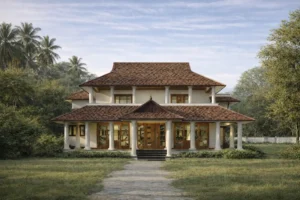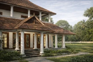 Located near Mukkad Church near Kavanad, Kollam, this residential villa is designed as a modern home inspired by the timeless charm of Kerala’s traditional architecture. Surrounded by greenery, the house feels calm and welcoming, offering a comfortable setting for everyday family life. The design is shaped by sloping tiled roofs, wide verandahs, and deep overhangs that provide shade and protection from Kerala’s heavy rains. A wraparound porch supported by elegant columns creates a pleasant transition between indoor and outdoor spaces, encouraging relaxed living throughout the day. Natural materials bring warmth and character to the architecture. Timber-framed doors and windows stand out against the clean white walls, while the layered rooflines give the home a grounded, familiar presence. Large openings allow soft daylight and fresh air to flow easily through the interiors. Bringing together Kerala’s architectural heritage with modern comfort, the villa offers a peaceful family home that feels timeless, grounded, and connected to its surroundings.